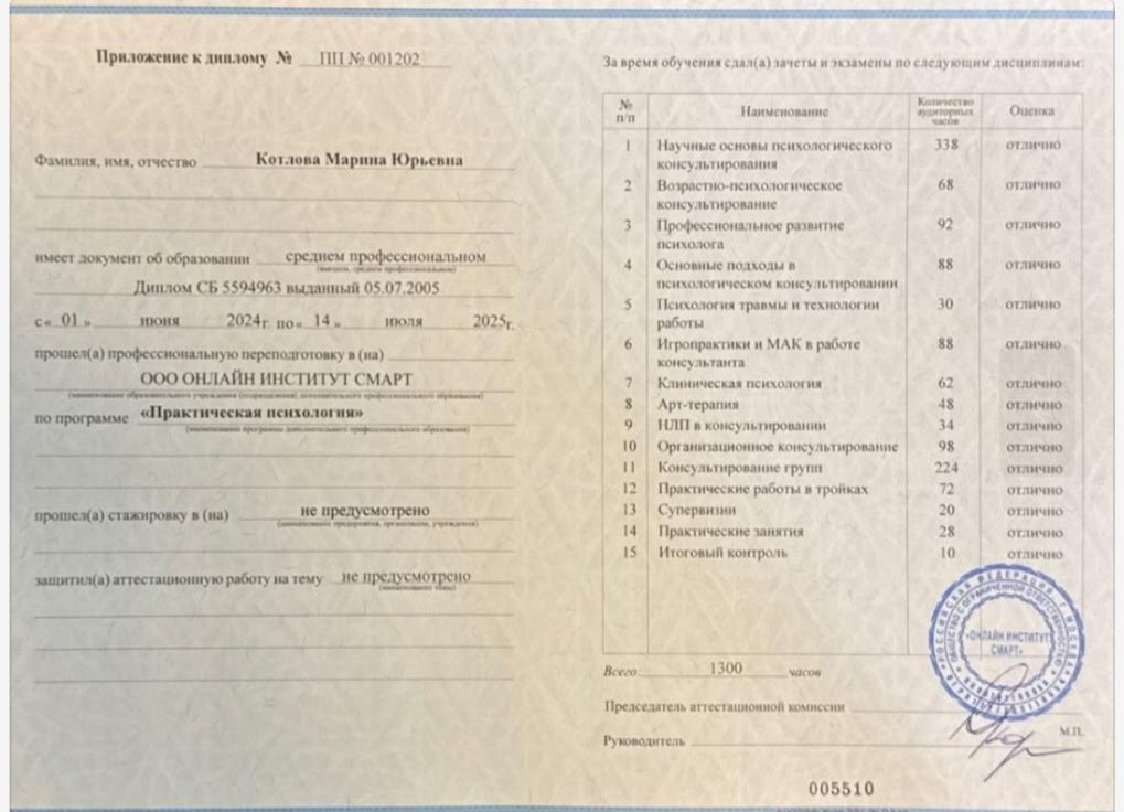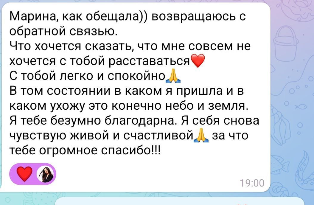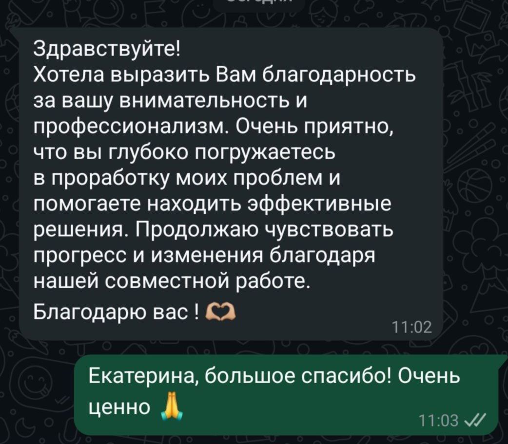 Задания между сессиями — не экзамен, а поддержка. Они закрепляют результат и дают вам инструменты самопомощи здесь и сейчас. Все практики адаптируются под ваше текущее состояние и ресурс. Главное — ваше желание меняться. Я всегда на связи для поддержки и корректировки плана, если это потребуется.