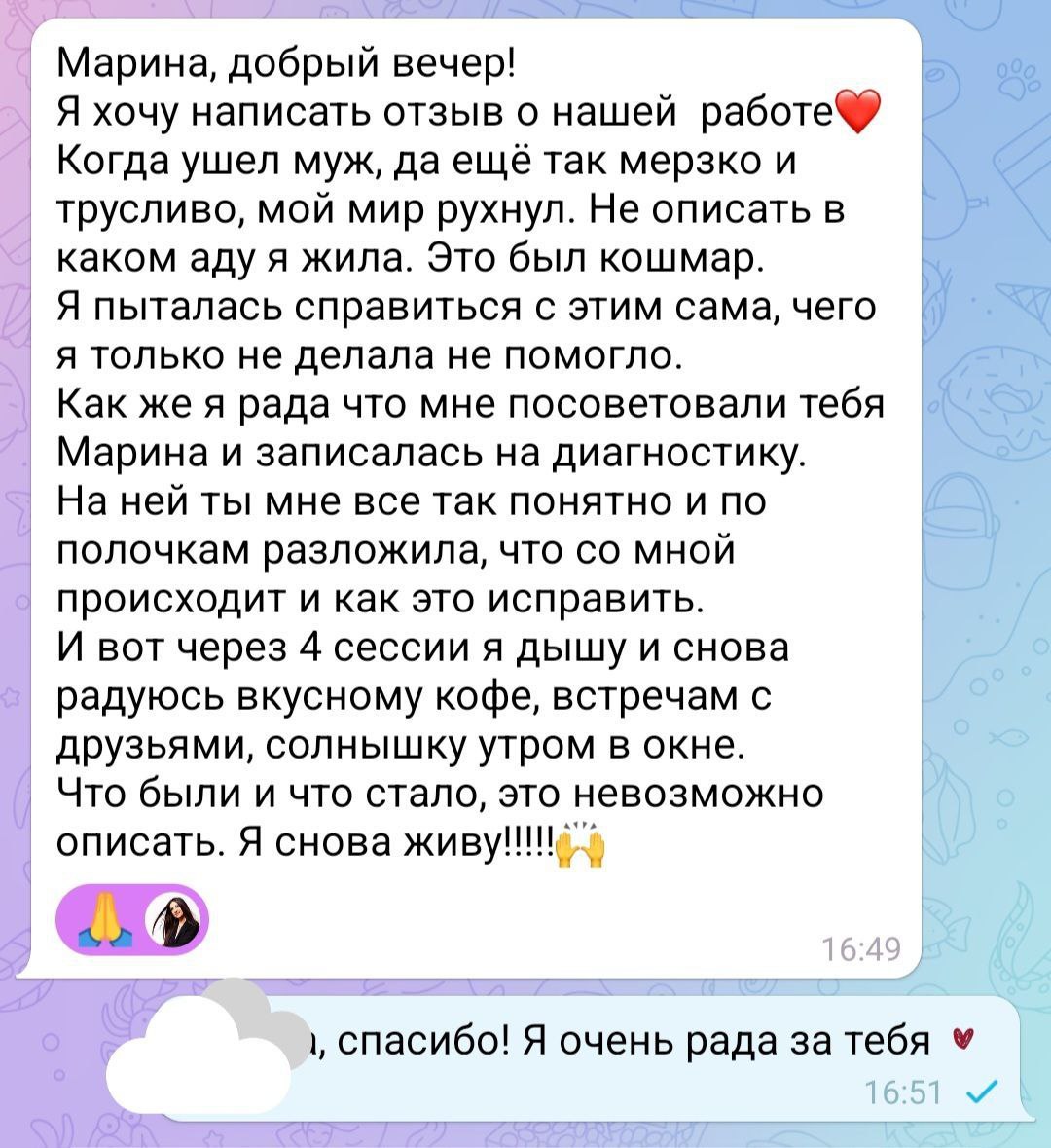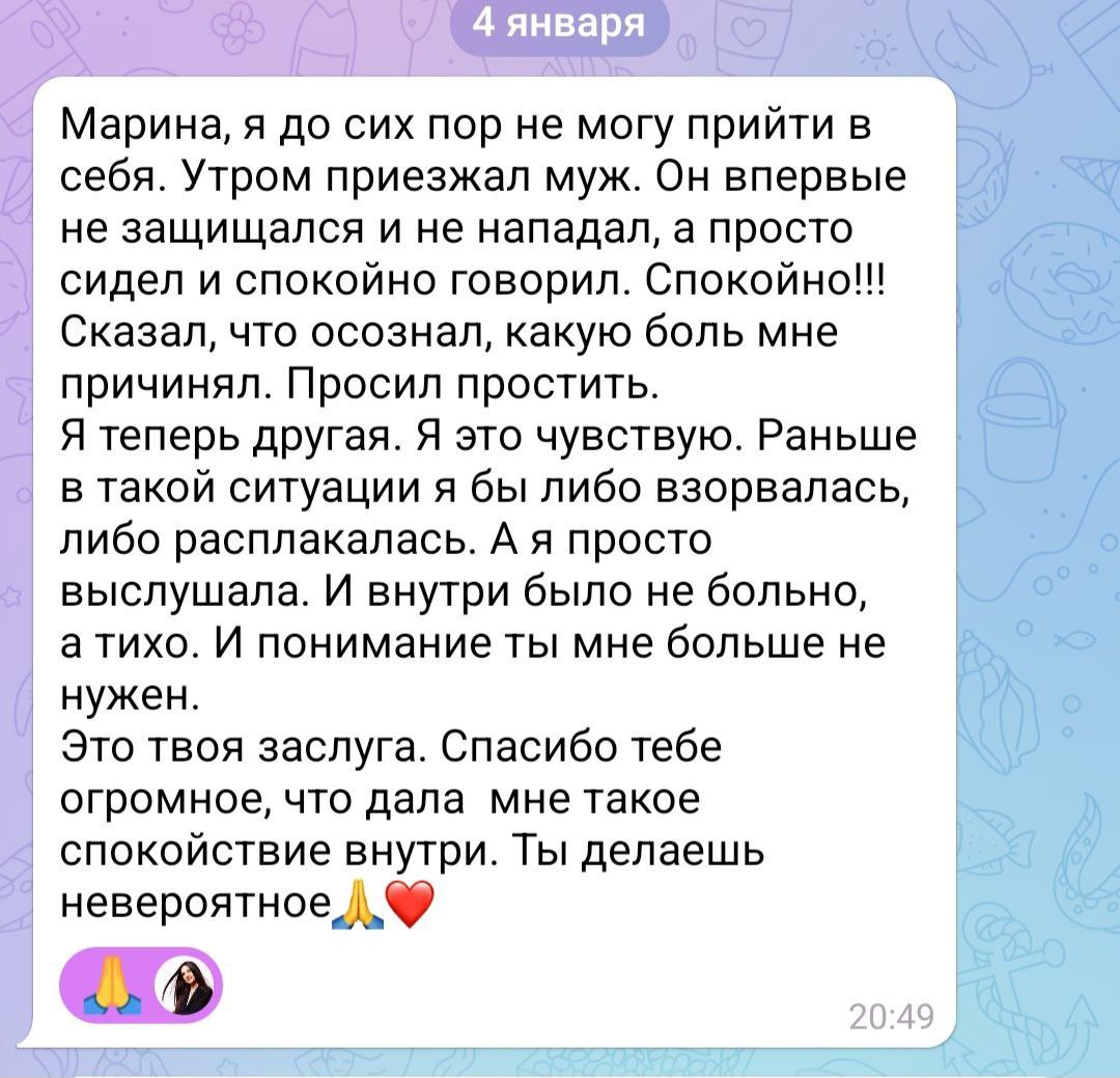 «Самое страшное было не его предательство, а мое собственное решение уйти в эту пустоту. Казалось, там смерть. Но вы показали, что на самом деле там тишина. И в этой тишине я наконец услышала себя. Не ту, которая ждет удобного момента в его жизни, а ту, у которой есть своя жизнь. Я выдохнула. Впервые за три года».