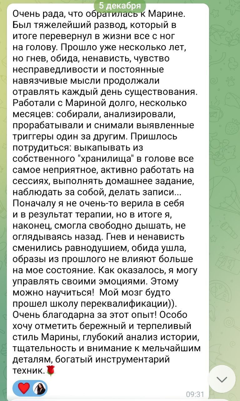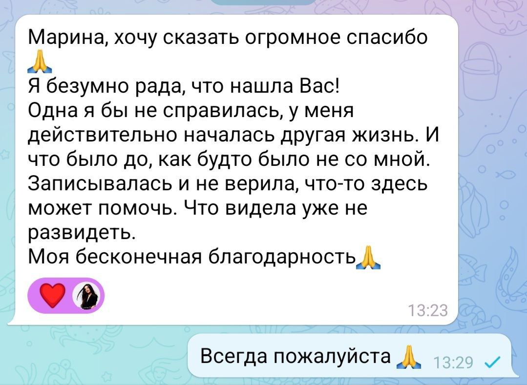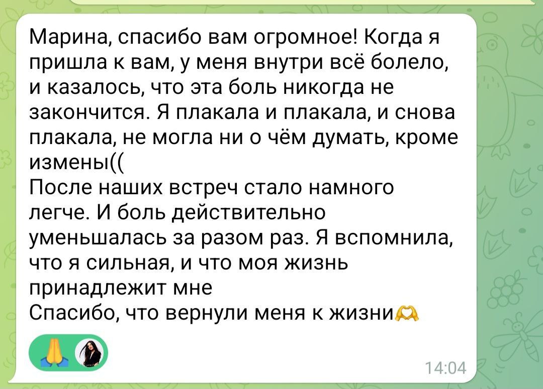 С помощью мощнейших инструментов уберем боль. Перестанете прокручивать в голове "кино" с его участием. Сможете принять решение уйти или остаться без мучительных сомнений, основанное не на боли и панике, а на ясности и уважении к себе.