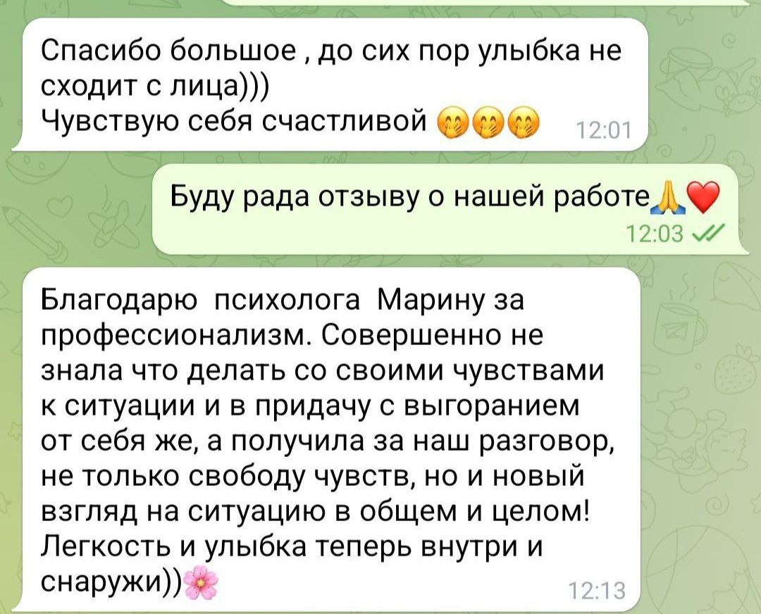 Не ждите, пока боль и обида заберут у вас всё. Каждый день отсрочки это шаг к ухудшению ситуации. Но хорошая новость в том, что вы можете остановить этот сценарий уже сейчас. Запишитесь на диагностическую сессию чтобы получить персональные рекомендации, разбор вашей ситуации и, конечно же, искреннюю поддержку от опытного психолога.