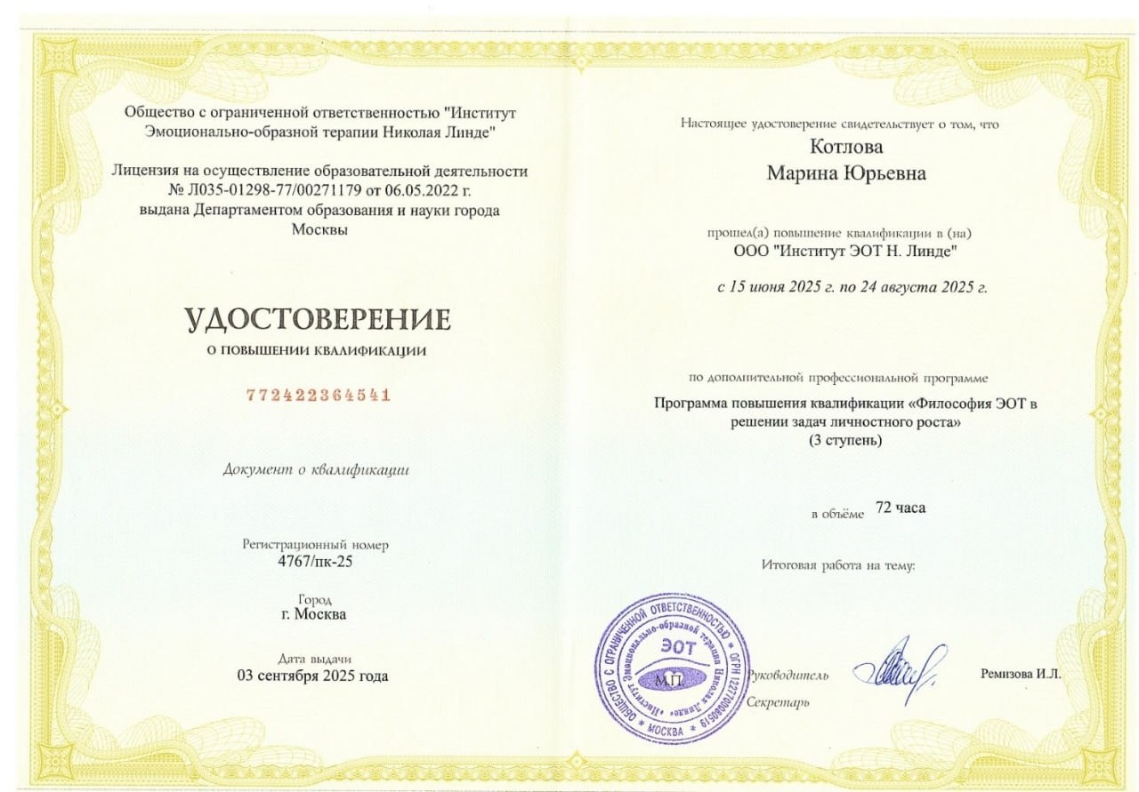 Через ЭОТ мы превратим телесные спазмы - ком в горле и тяжесть в груди - в управляемые образы, а затем трансформируем их. Вы вернёте себе лёгкость там, где сейчас камни.